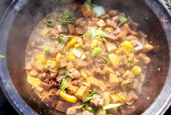 员员工们分组协作,有人负责劈柴生火,有人负责清洗处理食材。当柴火在土灶里噼啪作响,铁锅渐热,烹油下料,香味瞬间弥漫开来。大家轮流上阵翻炒,加入山泉水慢炖。不一会儿,浓郁的香气便笼罩了整个场地,勾起每个人记忆深处的家乡味道。一锅炖菜,凝聚了众人的劳动,也炖出了同事之间热络的情谊。