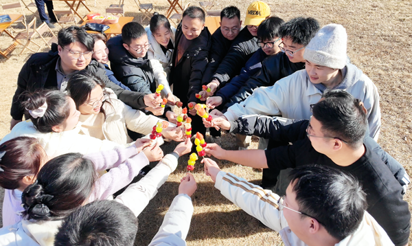 另一边,制作糖葫芦的区域欢声笑语。工会准备了丰富的食材:传统的山楂,清新的草莓,软糯的香蕉,还有近年来备受喜爱的阳光玫瑰青提。员工们发挥创意,自由搭配,串出一串串造型别致的水果串。看着冰糖在锅中慢慢融化,变成晶莹剔透的糖浆,大家小心翼翼地用串好的水果蘸取糖汁,轻轻一转,冷却后便形成了脆甜的糖壳。自己制作的糖葫芦,吃起来格外香甜。