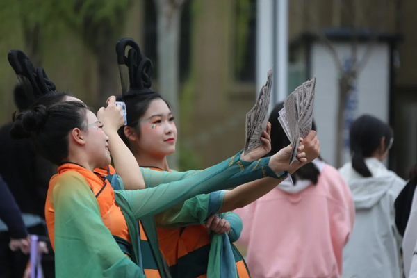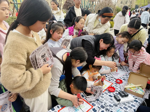 活动现场,小荷舞蹈艺术培训中心带来《百舞惊鸿》《橘颂》两支舞蹈,舞姿曼妙、韵味十足;四月汉服带来古琴演奏《秋风词》、古筝独奏《兰亭序》以及舞蹈《四大美人》,琴音悠扬、舞姿温婉,尽显古风雅韵;中烨集团带来的《桃花笑》,节奏轻快、活力满满。除了风雅的传统环节,趣味十足的互动小游戏更是让现场氛围持续升温。每位参与者都能领取专属银票,凭银票即可参与投壶、糖画、飞花令、古诗词接龙、拓印、花钿制作、蒙眼挑战等丰富多样的趣味项目,更有“财神”NPC亲临现场送福,“赌坊”互动添趣,兼顾了观赏性与参与感,老少皆宜、欢乐不停。